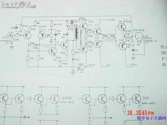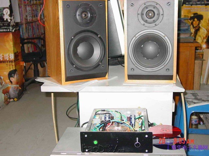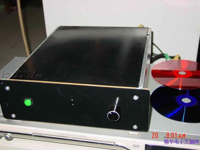 1993年的时候在音响世界9期见过这个放大器的图纸,电路是很早年间的美国JBL公司制作的功率放大器,电路上没有特别的花哨之处,据说在当年还红及一时;也许是因为那个年代的扬声器灵敏度高吧,几十W的功率就能满足一切,当时并没有在意,毕竟功率很小的放大器对于我来说还不能吸引我的眼球!!为什么呢因为时下喇叭的灵敏度越来越低了,在那时搞大功率的器材是我的理想,这个电路功率也不过几十W当时就没有选择制作这个电路而是选择了一款100W左右的功放电路,在仔细研究后还是决定暂时放弃实验这个电路,等以后有机会在搞一下这个当年很优秀的作品.这些年大功率的器材做了很多自然经验也会随着制作的数量有所提高,我所做过的器材中都是仿效比较优秀的电路,但是真正比较满意的作品并没有几个,原因很多说都说不完,近几年由于工作较忙也不会有太多的时间来玩了,自从登陆音响DIY这个大家庭又有制作的欲望!!!这两年间看到不少朋友都拿出自己的作品来参加比赛,当然了很多朋友不是为了我们论坛里的奖品,主要是在这个比赛中想得到的是制作后成功的乐趣,同时拿出自己的作品来和朋友共勉. 今年的比赛开始的时候就有了要制作一款作品来和大家凑个热闹的想法,可是半年过去了还是没有拿定主义,主要是因为很多朋友的作品令我很佩服不管是电路形式上还是制作水平是都是一流的,这不免让我有了怕的感觉,眼下就要到比赛的末期了在不搞的话今年真的就没有机会了。 我制作的这个电路上面说过了,她是古董级别,是60年代的作品,电路形式上在现在看来就比较简单了。可是你仔细研究一下就会发现有很多过人之处,比如第一差放级的第一只管子前面又加了一只管子这样电路的好处是能很好的减轻输入级的负担,因为前一级的灵敏度很低(说明一下一差放级是共集电极工作方式,有很高的输入阻抗很低的灵敏度),第二级不是我们常见的差动方式放大而是由其平衡臂的发射极将信号进行转换后送到下一级,前一级的输出给第二差动进行放大,整个线路的增益不是很高不过还是很够用的,推动级和输出级采用三级达林顿电路这样的好处是很多的,可以减轻整个前面电路的负担同时又能改善驱动负载能力,这是电路上比较有特色的地方,电源上也很新颖,这样的电源电路在现在的放大器中也不很常见了。她的电源采用了多级供电方式,变压器采用多抽头方式工作,这种设计方式能很大程度上减轻电路的无用损耗大大的降低电路互相之间的影响,朋友们都知道电源是放大器的血脉好的电源无疑会增添整体电路的稳定同时使器材最大限度的发挥作用!这本书上介绍了电路的特性同时还特意推荐了一个适合我们工薪阶层制作的这款改进后的线路,当然了要是条件好的朋友依然可以完全仿纸的,本人由于条件限制就没有按照原电路,而是采用了作者推荐的简化电路. 简化后的电路制作起来就比较轻松了,电路最终选定了10W的输出功率,呵呵有朋友看到这里的时候一定会笑了。这十W的功率///????是否值得去做?可以肯定的说值得,我在做成品之前先做了一些实验,先是用我们常说的洞洞板组装起来然后调试,很容易就成功了。 在实验的时候才发现这个电路非常稳定,电路的调试也是异常的简单几乎零件安装后简单的调整一下零电位,在调整一下末级电流就可以使用了。 制作当中要选用原机的零件型号恐怕是不大可能了.毕竟60年代的零件是不能保持到现阶段在生产的,与其等米下锅还不如找米赶炊,电路的电阻都采用了1W的电阻用的也并非名品.说实在的吧,我都不知道这些买来的电阻是那里生产的,只是一般的电阻,电容采用的电解和瓷片系列,晶体管采用了前几年的存货型号为B649和D669为一 ,二 差动级,推动级再用的是2073 ;940 .功率级为东芝C5198;A1941整个电路的造价也不过200元,呵呵机壳不算在内,变压器为50W环牛经自己重新饶制后得到双13V电源,就是这电源费了我好多工夫,电路板是自己刀刻,连接线为国标优质电线,为0.5平方毫米机壳是从进口防盗设备拆下的.这个电路是乙类工作方式很省电. 整个电路的测试了一下还是比较令人满意的,由于本人的测试设备比较简单只有一块数字表,和一台20M的双踪示波器,信号源是那位独门AK朋友提供的网络下载的信号源,示波器自带的1000HZ方波基本上没有失真的地方,电脑的信号源从100HZ--20000HZ正弦波都能表现,有的朋友说你为什么不用方波测试不是更能说明性能吗,我下载的信号源是有方波的,可是不知道为什么.一打到方波上就失真,开始以为是我的器材问题后来从示波器上直接接到电脑输出部分依然是失真的这才知道是信号本身的问题,也许是我的声卡有问题不过正弦波却是很好的,没有失真,后来就决定用正弦波测试了。有朋友要是仿制的话可以用方波测试,你会发现会有很高的性能指标,因为我用失真的方波测试同样能输出方波只是我的声卡失真严重,在喇叭端的也是比较严重的失真不能做为说明指标,还有就是我测试的信号是接音箱测试的并非接负载电阻方式测试,我觉得这样的测试才能真正体现你的放大器性能,因为喇叭负载是复合阻抗这样的负荷要是能输出好的波形其性能是可以肯定的。 机器的好坏最终是要靠耳朵来收获的,经过几张CD方音测试后,才领悟了JBL功率放大器的性能所在,这个电路几乎有很稳定的电性能,