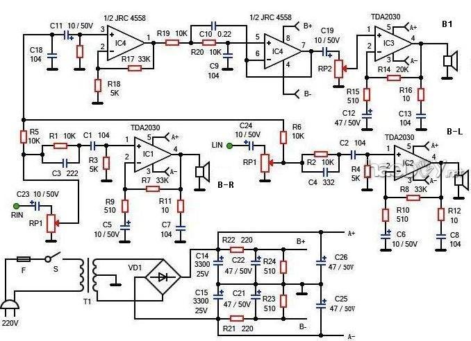 手头刚好有几只TDA2030,用来做个电脑的功放。在网上找了张电路图: 电路图主要分为三个部分:电源电路,卫星箱功放电路和重低音功放路。 电源电路:市电经过保险F--开关S--变压器T1降压--VD1整流--C14,C15,C26,C25滤波得到功放电路所需的双电源,另一路R21,R22降压--C21,C22滤波后为IC4供电。 卫星箱功放电路;(以R声道为例)输入信号经C23藕合--RP1音量电位器--R1/C3高音提升电路--C1藕合--TDA2030放大由4脚输出。R7为反馈电阻,R7/R9决定2030的放大倍数,R11/C7为扬声器补偿网络。 低音功放电路:由R5,R6从R,L声道中取信号--C11藕合--4558前置放大,R17/R18决定放大倍数--R19--IC4B,C9,C10,R20低通滤波(滤除200Hz以上的频率,让200Hz以下的频率通过)R20,C10决定截止频率--C19藕合--RP2音量电位器--IC3放大--推动B1。 ![]()