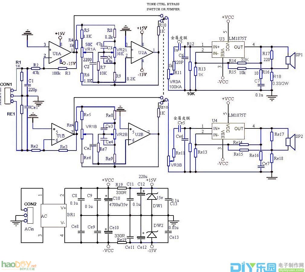 记得有几次跟站友们聊天时被问到,站上的的几个DIY后级, 功率对有些人可能有点大,跟本用不著,装了100W的TDA7294,然后在小小的宿舍里只能音量只能开得小小的,@@...........站长不弄个小瓦数的后级来玩玩吗?其实早就想过,但好声还是前提,不要说功率小一点就牺牲了音质! 考量小功率、电路简单、最好含音控(有些人好喜欢有音控的后级)、成本低、DIY容易(最好能给一些高职或专科电子科的新手实习,打完分数后还会想把它带回家)…. 想了好久,我看定位在20W~30W之间好了,也到网路上比较了好多电路,最后选择了LM1875这个功放IC的电路,巧的是,看了看还是对岸松胜的电路看来最好,评语也不错,但我个人想比较一下不经音控的真实音效效果如何,所以为它加上了音控Bypass的选择。 关于LM1875的详细内容我就不在文中特别说明了,相信大家可以找到它的DATA SHEET。 网路上也多人把它拿来比较低价位的TDA2030,且在市面上好像也留传不少是由TDA2030把字磨去,重新Remark成LM1875来卖,由于差价很大,自己买时小心一点,太低价的大概就有问题了,在规格上来说TDA2030是差一点,但如果要试试也未尝不可,脚位完全相容,可直接替换,但要小心, 它的工作电压较低,在使用TDA2030时用电压较低的变压器,比如输出为AC 12-0-12 V的变压器。 修正后的电路图如下: 电路板的LAYOUT,由于面积不大,这次採用双面板相信也成本也不会高太多,且在上层全面铺地,讯号处理会更为乾净。当然要一次LAYOUT成功好像也不容易,做完的板子,一开始焊就发现,上层贯孔的焊点在锁散热片时会短路到,结果先把上层的跳线挖去,先从下面焊;做好之后,一上电,量输出直流0V,已放了半个心了,通常我会由讯号产生器上送个讯号,到放大器的输入,输出先接示波器来看波形,一方面可以看有没正常的放大,另一方面也可以看看有没杂讯,好像都不错;再来试试Tone Control Bypass看看,结果没声 ! 用示波器一追,哇!Jumper那里的Layout错了,只好先以手工切铜箔、加跳线修正电路,全部OK了,大家也可放心,POST上来的电路板LAYOUT图档都已改正过了,是正确的,完整修正了。 再来当然是实测了,接上自己的DAC上音源,接上喇叭,先试有音控的效果,耶!自己做的自己夸一下,没想到小瓦数的AMP也有这样的效果,音控的控制能力也不错,虽可感觉瓦数较小,但声音算来还很温顺,OP原使用TI的NE5532,已经算有水准了,也换了大S的NE5532看看,声音好像更温暖。 当然也要试试Bypass音控后的感觉看看,当然高音消了一点,但算圆润,低音的感觉差别较大,少了音控的BASS,当然低音没那么沉了,但我想这就是原音的感觉,毕竟LM1875本来的风评就不错! 当然不同的人会有不同的感觉,由你们自己来品尝啦。 这是我完成后的照片: