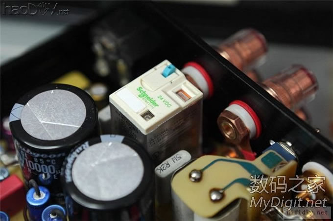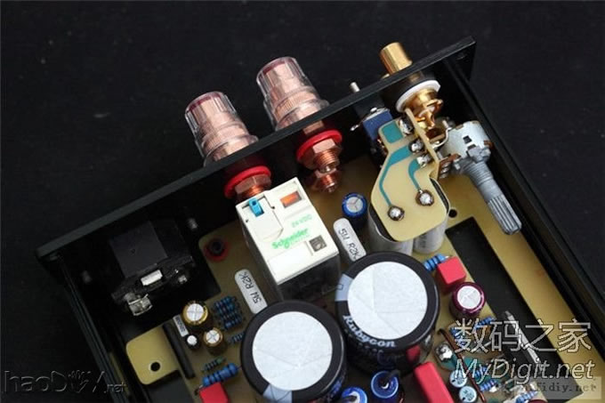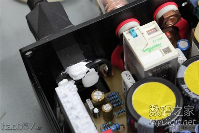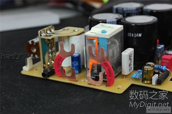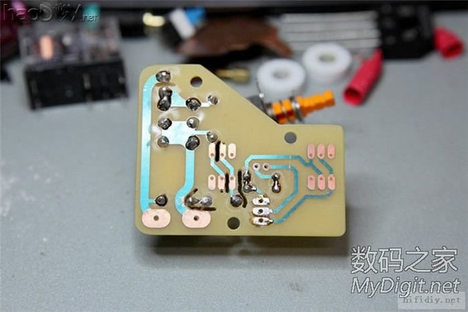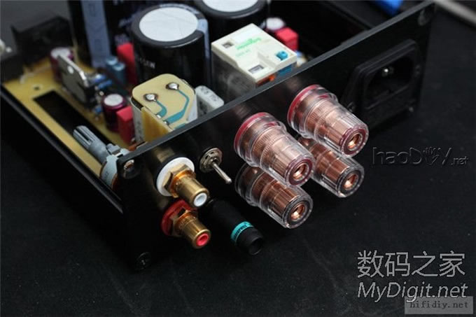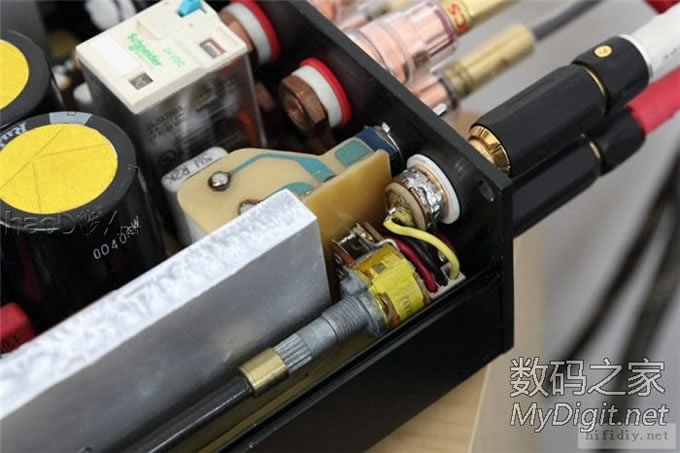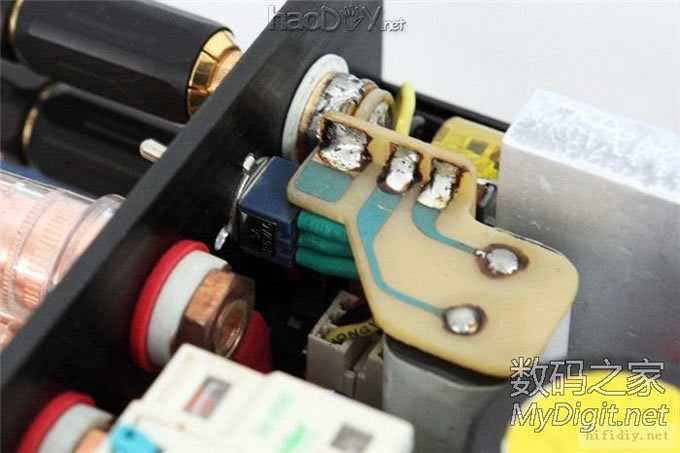 电位器快贴在机壳上了,所以也用高温胶带贴一下。两个RCA座用粗铜丝绕一圈后焊死,防止打转。 ![]() ![]() 这是手动音源切换的开关,刚好在原来焊继电器的位置焊上两个3针插座连接。 ![]() 接地位置,采用的是直接接地。电源插座是焊接出线,然后用硅胶密封了一下。 ![]()