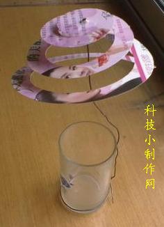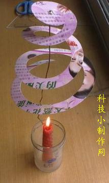 金属扣眼与铁丝尖端的摩擦力很小,轻轻一吹,螺旋体就会旋转起来。下面我们要做的就是点燃蜡烛,让蜡烛的火焰发生的热气来吹动螺旋体。