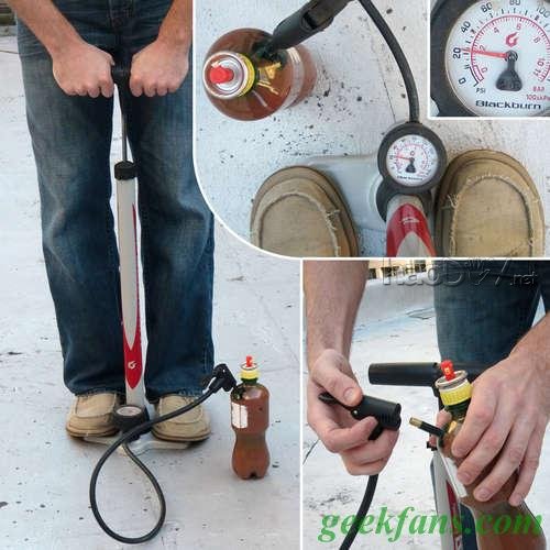 此刻可以往瓶子里打气,打好之后廉价的喷漆瓶就可以行使了。 用自行车打气泵往里打气,约莫20psi的时辰结果不错。这里有个要点,加压过大的话会使油漆瓶破坏,最也许是在喷嘴的毗连处裂开。以是提议从较低的压力开始,凭证试验结果逐步加大压力。 加压时辰盯紧了,确保瓶子没有正漏、侧漏各类走漏。 我把瓶子加压到25PSI如故没有发明任何走漏,在密封处多加些胶以防万一老是没错的。 喷射啦!!!!!! 7 喷射