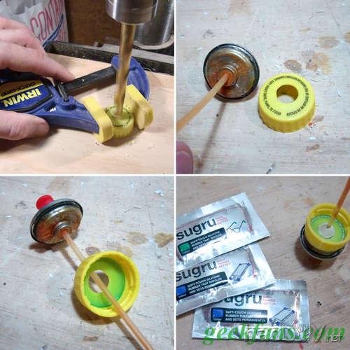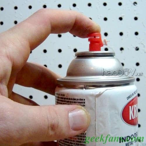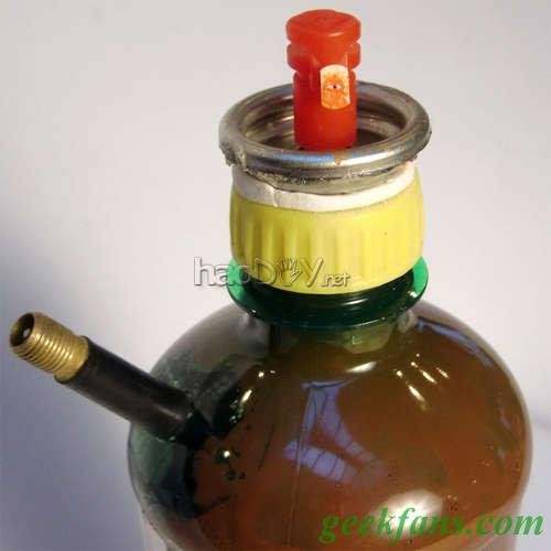 必要在PET瓶盖上做一个启齿,然后装上从旧的喷漆罐中拆下的喷嘴。对我的喷漆罐而言,这个启齿的尺寸应该稍大于3/8英寸。 我试了很多种粘合剂,最后以为照旧Sugru牌的最好,我把它看成腻子涂抹在启齿周围而且粘上喷嘴,一晚上之后就坚贞了。 在胶完全固化之后必要用自行车打气泵做个测试,以确保密封精采。假如什么处所走漏的话,就用更多的胶堵漏可能从头粘接。密封好是要害! 5 从头填装油漆