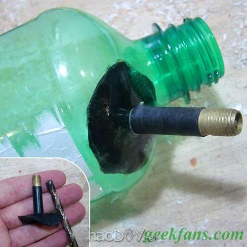 这一步里必要一个单向阀给DIY的喷漆罐充气,为此我从一个废弃的自行车内胎上拆下了一个气门。现实上任何相同的单向阀门都可以,我用这个是由于它很好找,任何一个自行车补缀店里都有大量废弃的自行车内胎。 剪去阀门旁边的内胎,只在周围留下12mm阁下宽度的橡胶裙。 接下来找个直径和行使的气阀巨细相等的钻头,对车胎上的那种气门,一个1/4英寸的钻头较为吻合。在PET瓶肩上钻个孔,修整钻孔进程中留下的毛刺,然后将气门从瓶口送入瓶内,最后将气门柱从刚钻的谁人孔伸出来。 最后通过瓶颈发火门的橡胶裙上涂少量的橡胶粘合剂,将气门向外拉使橡胶裙与PET瓶的内壁打仗。也许必要用手指顶住粘合部位确保打仗精采,粘好往后最好等一夜来担保强度。 4 喷嘴