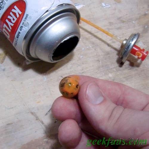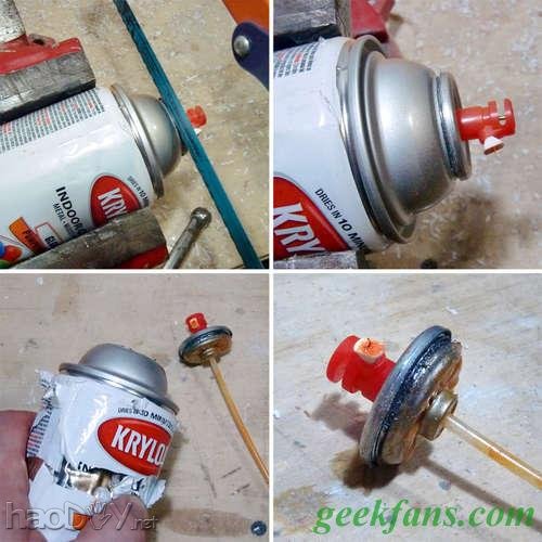 找一个旧的喷漆罐,压喷嘴喷干净内里的对象,破除剩余压力。 这一步很重要,假如罐里残留压缩气体什么的轻易在切开时激发爆炸,这可欠好玩! 开释内部压力之后,将罐子在老虎钳上夹住,然后从罐颈切开,将罐子分成下边的罐体和上部的喷嘴两部门。留下喷嘴和在罐体里找到的玻璃珠可能大理石柱,剩下的罐体部门可以甩掉。 编辑注:嗯,甩掉,很兴奋没有再一次看到“妥善处理赏罚”神马的…… 3 充气阀