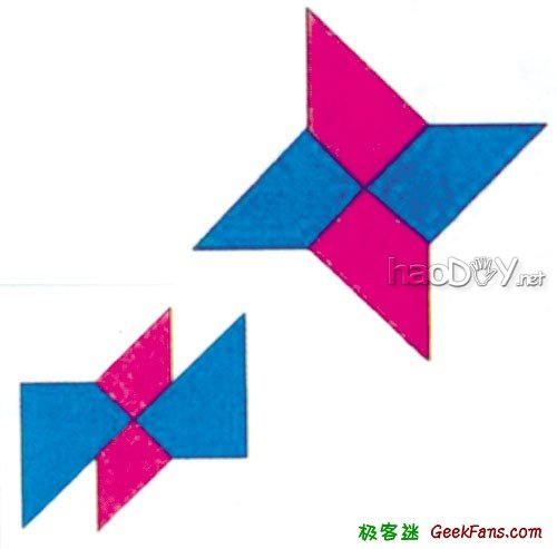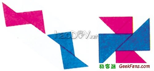 第三步:接下来就要对接了。先将折好后的两张纸摆成如图的位置,然后将个中的两个小三角插到其它一张纸的误差里牢靠住。然后再翻过来,把其它两个小三角插到之前那张纸的误差里。这样,一个帅气的飞镖就做好啦!