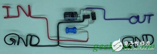 右边的三个电线,代表了我们前面的电路的三个端口,最下面的负极要放在整个我们电池的负极,而输入端要跟我们的电池的正极连,最后输出端要放在整个电路的最前端,思路弄清楚了,我们就要开始做电路部分了。 我们先在万能板的边上,以IC的脚的排列方式,切开两条沟, 以IC放下去,三个脚不相碰为准
