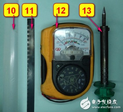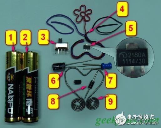 图中, 1和2是两节电池,其中一节是有电的,另一节是基本上没有任何使用价值的电池, 3是一个小型的钮子开关, 4是三根电子线,(我这里选用的是红色、黑色和白色) 5是一个专业的小型化的升压IC,型号是2180A,规格是1114/30,最后面的30是它的输出电压是3V的意思,这个IC,它的生产厂家是深圳英康科技有限公司,(注意:你买IC的时候,它是可以分为内置二极管和不内置二极管的,如果内置二极管了,则第8个的肖特基二极管可以不用理会了) 6是一个小型的电解电容,规格是16V/100UF, 7是一个小型的电感,你可以选用的规格是22UH~100UH之间, 8是5819肖特基二极管,(不知道什么是肖特基二极管的同学,请自行谷歌之) 9是一截焊锡丝, 10是一节热熔胶条, 11是一节钢锯条, 12是万用表, 13是电烙铁,