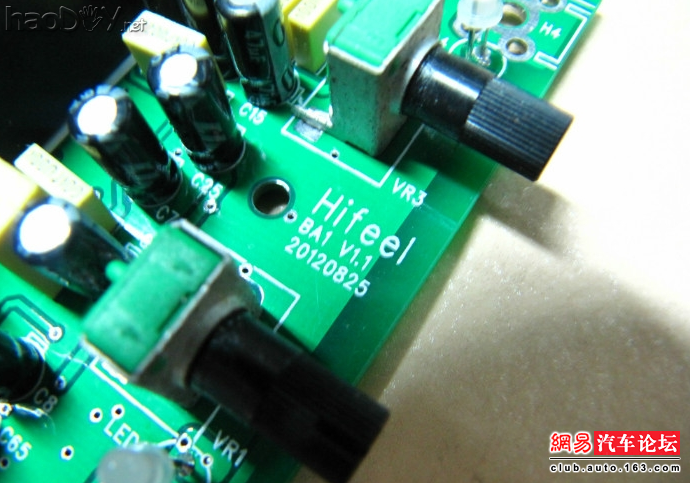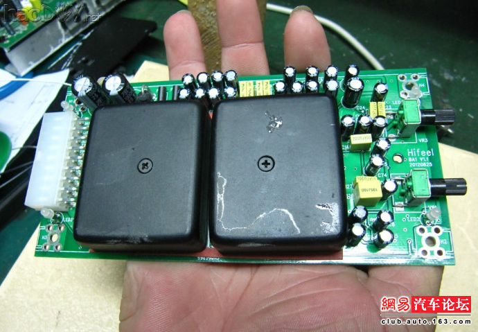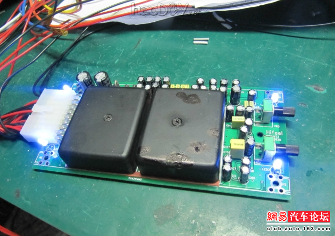 经过2次的修改,最终确认OK的蛋蛋功放主板。这个是半成品,成品还有铝壳。啰嗦点,不然一些车友又说看不懂了。呵呵。。。 修改2次花费的时间确实是漫长的。。。。。 蛋蛋的功放正面