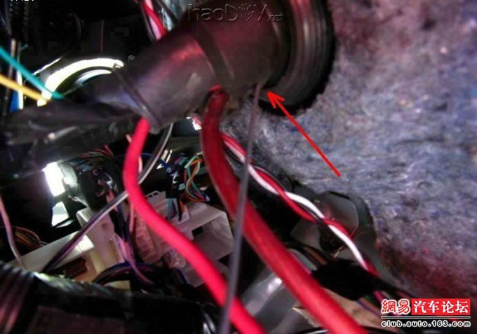 2.从方向盘根部(红色箭头指示位置)穿铁线至电瓶处。
