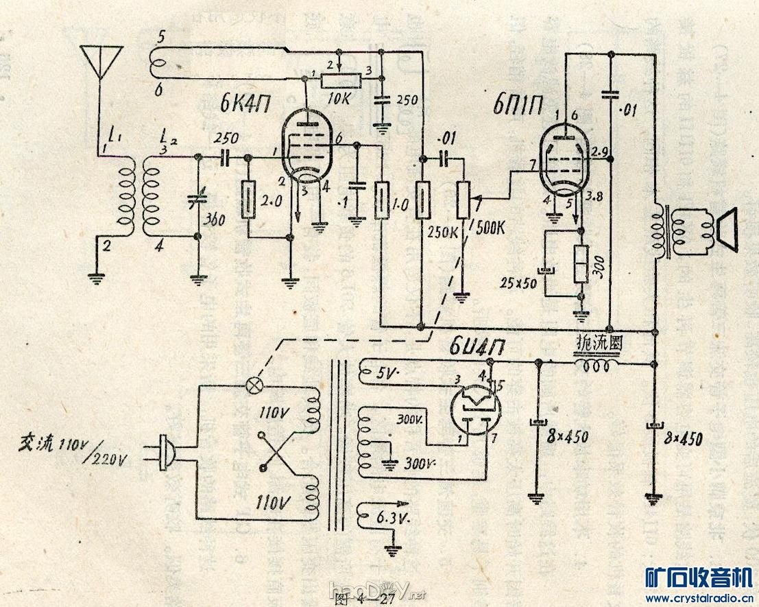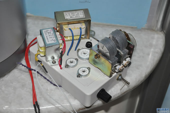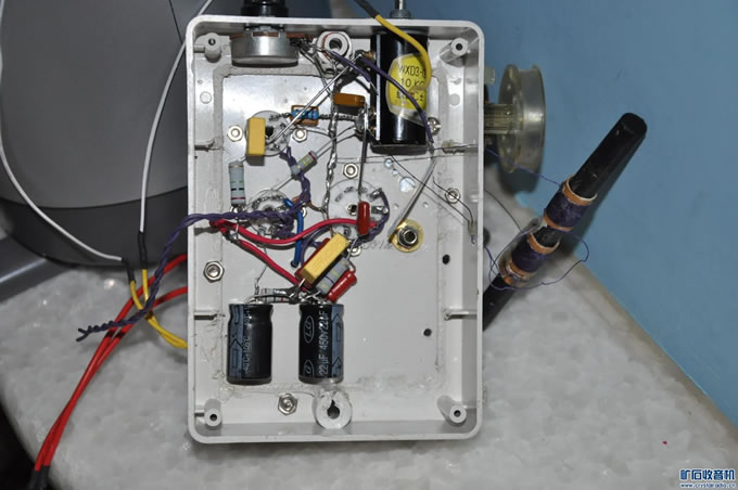 既上回参赛的大八角三灯机不成功,但又想听听再生机的风采,所以又制作了一台三灯再生式收音机。 6K4+6Z4+6P1, 输出变压器是小电源变压器。 波段为中波。 线圈是磁棒的。三个线圈。一个小的是再生圈,两个大的是相连的调谐圈,一个调谐圈与再生圈放在一起,调节另一个便可以调节频段,所以如果收音机在某个频段变现不佳(再生式收音机都会有点这个问题比如“死点”)可以调节一下这个线圈便可把你要收听得台移到灵敏度和选择性都好的地方收听。清晰、不串台 调节再生的是10K多圈电位器,转同样的角度下电阻变化比270°的电位器小多了,方便调节,解决了再生不好控制的问题。。 现在还不太完善,灯丝还用的是外接电源,等买来了变压器就装上,就用本机电源了。 能收约10台(在楼房里不接天线的情况下) 外壳处理的还不太好,但收听效果不错。图中的音量电位器还未接上。 只好等下周处理好了再上图