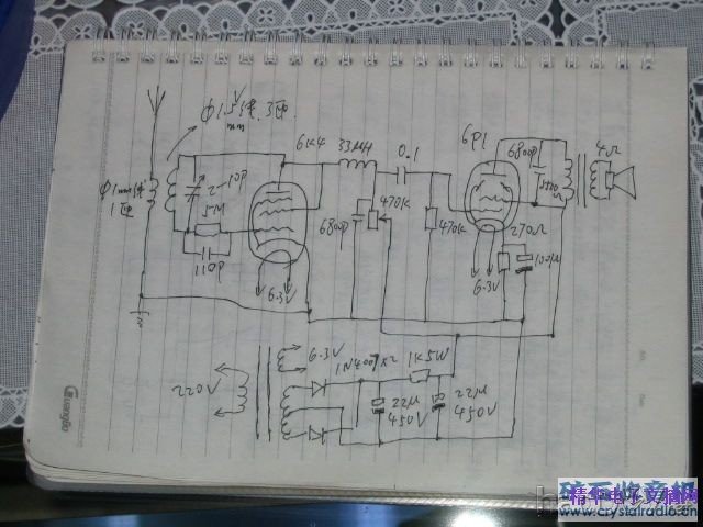 今天我做了交流供电电子管接收FM的超再生实验,电路图如下面照片。