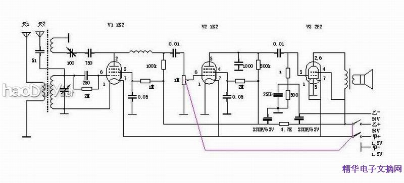 本机甲电使用一节1.5V大号电池,乙电没有采用低乙电电路,使用6节9V的6F22层叠电池串联,新电池时电压接近60V,可保证各电子管最高效率地工作。各线圈全部拆自晶体管机器,使用100pF的空气可变电容调节再生,非常平稳。
