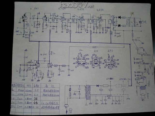 经过努力,小弟的FM基本收尾了,能收到本地几个强台,感觉成功但不完美,因为离自己的要求还有差距,所以发个视频上来让大家参详一下,如果大家觉得比较满意的话,那么我把所知道的都发上来共同学习,如果相差太远,那我就先放下,待老师同学有好的经验,我再继续改进 ,机器为6管,AFC没装.从头到尾:6N3---6J4---6J4---6J4--6F3----------6N3,频率覆盖可达18MHZ,最高本振频率可达110MHZ. 高放-混频--中放1-中放2-限幅放大--电压/低频放大 | AFC/本振 今天上视频之后一直开了4小时,可靠性尚可,一个星期内上图和资料,请关注的朋友等待. 我先上图片:首先是电路图,这里有张原图,然后考虑到灵敏度的问题,在参考了其他图纸之后再拼凑成现在的工作图,在调试的过程中又更改了小部分,本振改成YCCUI的调屏式.大型元件买回来后尝试几种摆位,取最紧凑而又合理的摆位,最后定下机器低盆的尺寸,面积约A4纸大小,高12CM,宽31CM,深21CM,到加工店买些边角料,找做坊开料折边,回来之后用手摇转和大小杂锦挫刀开出所有大小方孔圆孔,部分锣丝孔攻了牙,后面是用肥藻水清洁,沙纸打磨后用稍粗沙纸拉丝,绝对干躁后找个无风的日子喷多次清漆就成,如果要写字,就要喷漆前写上,喷漆后就很牢固了.我面板上的标识是用小铜线屈折之后用胶水粘上去的,喷漆之后一般擦拭是无问题的.