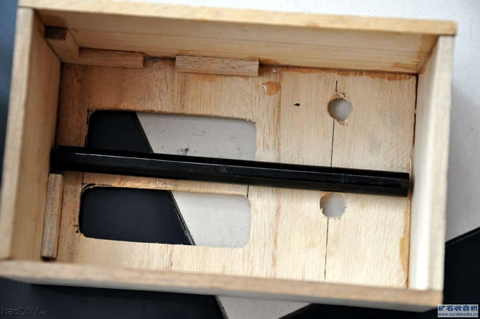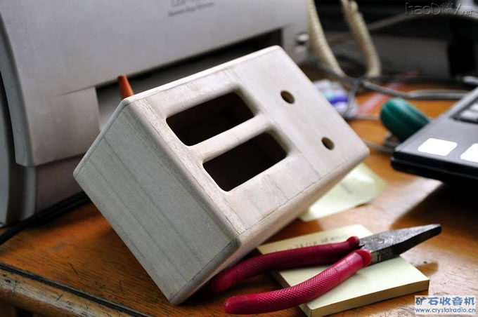 几种不同的磁棒 ![]() 尽量让双连和磁棒距离最远: ![]() 装进去刚刚好 ![]() 磁棒的固定方法很简单,在机壳的两个侧板上,用几个木方粘成10×10的空间,将磁棒放入即可。但是双连的固定有一点麻烦,因为这一种形式的双连是在前面打三个孔,用螺钉固定。我比划了一下,如果在前面板上打孔固定,则露出的三个螺钉头部会使得旋钮以及度盘的固定变得很麻烦。于是修改设计,先将双连固定在一小块铝片上,再用3×5木螺丝固定在机壳上。喇叭倒是早有计划,最外面用窗帘布作为喇叭布,中间一层用网板撑住,最后面是喇叭。之所以采用这样的结构,是因为我看到很多老机,年久以后喇叭布都被戳破,有的甚至导致喇叭纸盆损坏。我以为,原因是因为布的后面没有刚性支持,但是被戳是不可避免的,尤其是布年久老化以后,自然一戳就破。用了这一招以后,一般的戳戳碰碰都能够抵挡的了。 磁棒固定法和最终定下来的位置 ![]() 双连,铝板和衬喇叭的铁网 ![]() 还是回到木合的制作上。在木合的主体结构粘结牢固以后,可以进行第一次打磨,当然在打磨还有上漆的时候,双连等元件都还没有装上。我用的是230目和400目两种砂纸,并用到了装修时候用的那种砂纸板。就是那种两端有两个夹子,整个面积是半张或者1/3张砂纸的工具,是在百安居买的,大约10元。这是一种简单而十分有效的工具,我在此强力推荐各位在打磨机壳的时候,用上这种砂纸板,可以很容易的形成相当平整光洁的表面。因为在手持砂纸打磨时,因为手指的弧度,很容易打出高低不平的表面,这种情况在用230目砂纸的情况下很容易出现,有时一把下去,表面就能明显的摸出凹陷来。先打磨机壳上的五个平面(背板单独打磨),再把砂纸条固定在木条上,打磨喇叭孔的倒圆部分,喇叭孔的圆弧用砂纸裹在圆锉上打磨而成(当然也可以用其他任何直径适当的圆柱体)。如此打磨完毕以后,表面用手摸已经相当光洁。 用皮老虎吹去木粉,可以发现接缝的某些地方有点小缝。这是因为木头在裁切以及拼合的时候,并没有完全合缝所致。调和一些504胶,用牙签挑到有缝的地方。要稍微堆高一点,因为胶水会渗入木材中一部分,固化后高度会降低一些。涂的时候没必要太谨慎,胶碰到边上一些也无妨,因为还要再次打磨。 打磨完毕,补缝后效果: ![]() 放置一夜,等胶水固化。进行第二次打磨,这次用400号砂纸,配合砂纸板。这一次只要打磨到补过的地方也平整即可,因为其他部分原来就已经打磨成功了。这一阶段的重要步骤是打磨机壳四边的园角。又是得益于强大的砂纸板,用力均匀地先打磨出倒角以后,再做圆弧形的动作,就可以打磨出相当完美的圆弧来。再手持砂纸轻轻的打磨一下各个曲线部分,打磨工作即告完成,此时手摸起来应该相当顺滑。 圆角打好以后的情况见图: ![]() 吹去木粉,准备上漆。我就这个事情请教了不练先生,他的建议是可以用白乳胶加水先刷两遍打底,可我家那边的建材店居然关张了。于是采用B计划,用虫胶漆打底。我以前给一台外拍机做过油漆,还剩下一些虫胶片和酒精,这次正好用上。虫胶用酒精泡上,半天以后就可以应用了,漆片的渗透性极好,开始刷的几遍都看不出什么区别,基本都被木头吸进去了。随着遍数的增多,开始可以感觉到漆层厚度的增加。此时木头上有些在上次打磨时被压倒的纤维,因为漆的浸润而立起,导致表面出现很多点点,此时用1000目的细砂纸将其打去,吹去粉末后再刷几遍,等干燥后这一工序就成了。漆片的颜色可以产生出一种比较悦目的效果,不过这次用的是精制程度较高的虫胶片,所以颜色淡些。 涂完漆片后的情形: ![]() 接下来是喷光油罩光,效果是使得机壳有一个亮光的表面。这个步骤很简单,找一个气流稳定的地方,我是用的楼梯间,地面用报纸铺好,机壳架起来。每一次喷薄薄一层,等干后再喷,若干遍(大约十几遍)后即成。我买的是七元一支的光油,结果弄完以后一支刚刚好用光。罩光后的情形见图,此时的表面已经可以清晰的反射出周围的景象,木纹也很漂亮。 (责任编辑:admin) |