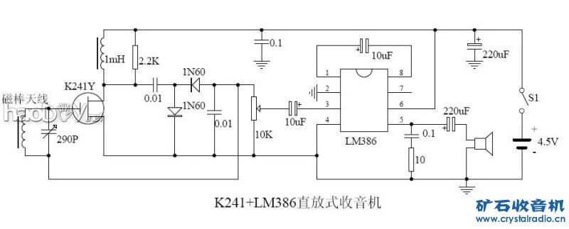 原理: 电路由一只场效应管2SK241Y做间接缩小,缩小后的信号由两只1N60检波,检波后的音频经音量管制电位器加到低频功放IC(LM386)的输入端缩小、推进喇叭放音。 磁棒天线线圈的一端没有间接接地,而是接在了音量电位器的上端,这样可能应用检波后直流成分来管制K241的栅极电压,,失去必定的被动增益管制成果。 特点: 电路简略、声响宏亮。任务电压范畴宽,3V-12V都可能反常任务而无需任何调整。经实验可能明晰地收听到大概10个电台的广播。 此机所用的元件很少,都是些罕见的元件,一切元件的参数都已经标在了原理图上