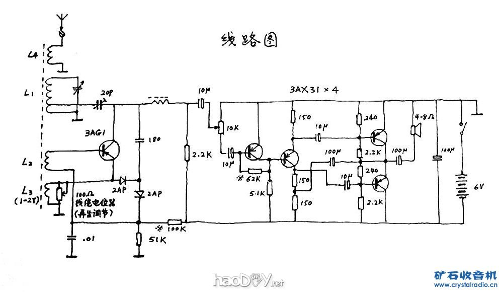 彩色水笔用完了,用其包装塑料盒做了一台5管收音机。 面板用彩色及时贴装饰。面板上的铝质扬声器罩用的是成品半导体收音机用的处理品;调谐旋钮上标注的是旋转角度。左下方小旋钮为音量控制兼电源开关;右下方小旋钮为再生控制电位器。中下方是发光管电源指示灯。为了增加面板强度,紧贴其内侧加了一块约3毫米厚、上过清漆的胶合板,机内元件也固定其上。 电路采用高放再生来复式。低放、功放部分采用无变压器交连的乙类单端输出电路。电源电压为6V. 本机再生电路及其调节方式比较特别,采用电容、电感复合回授方式。电容回授为固定式;电感回授为可调式。电感的调节办法,是在回授线圈两端并联一只100欧姆的线绕电位器。这一突发奇想的再生调节方法效果极佳,不但再生调节平稳,而且能有效展宽再生的灵敏点。 由于本机采用了复合再生回授、且再生可调,并采用无输入、输出变压器的低、功放电路;再加上使用200毫米的长磁性天线和100毫米口径的扬声器,故无论其灵敏度、选择性和音质都相当不错。本人曾于夏季下午5时左右携机到北京一公园试听,可以清楚地收听到近17个左右强弱不等的本地及外地电台广播。 请看所附照片 |