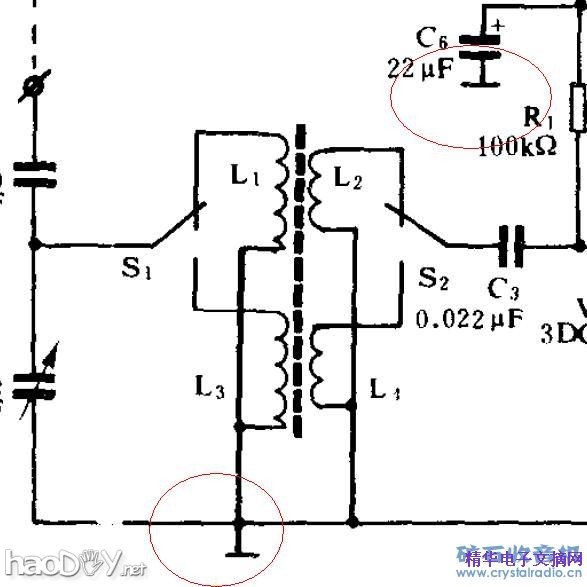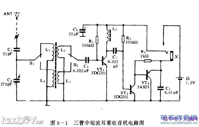 但是朝鲜语言的电台每天像念咒语一样不停的响,能收到俄罗斯的莫斯科之音(这一点让我很兴奋,这电台的试播歌曲真不错啊)。 总体表现:原图没有再生,我加了一圈再生。截取原图中波线圈,只留短波(为短波痴迷)。左手调再生,右手调频率。当再生调到恰到好处时,选择性很棒,音量震耳! 这个频率经常有很快电码和叽里呱啦业余无线对话(听不太清楚)。 为了声音能圆润一些,在原图的3ax31c上再加一个47uf。高频管则改为9018。电路板实在是没有啊,就用方便面里的卡通人物的卡片撕下油性的表层一面来代替呵呵。 注:图选自《新颖简易收音机制作》——《中短波三管机》。这图不错,很适合新手操作,希望有兴趣的朋友可以试一试,并发表一下您的收听及制作报告。 感谢版主,感谢坛里每一个人!!! (责任编辑:admin) |