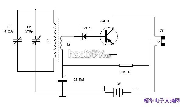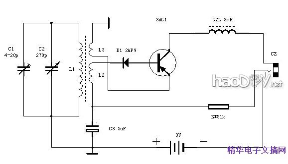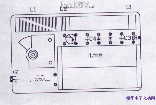 调试 (调试前首先确认有电台在广播)把R*的位置用一只100k电位器串一只30k 的固定电阻代替,电位器转至阻值最大处,再生线圈L3先不套进磁棒。确认接线无误后接上耳机、电池,再从大往小调整电位器,到某处听到耳机中有明显的“沙沙”声时停下,调节单连就可以收到播音。再调整电位器使信号清楚响亮。测量一下晶体管的集电极电流(也可以先把万用表串在电路中)在0.5~2mA之间都有可能,通常电流大声音大,电流小灵敏度高。