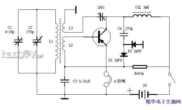 用图3-3的电路对我已经装好的单管机进行改造,期望它能工作的更好,但答案却不是唯一的。最后结果颇耐人寻味;性能不但没有提高反而产生了啸叫。顿悟到:原来装好的单管机因为个各元件的性能指标相互配合以及安装位置(不能忽略的因素!)在这里已经达到了最佳,如果再提高增益必然要啸叫,来复再生机不象外差机,既要想高增益,又要稳定地工作是很困难的。来复再生线路的根本缺点就在这里,但来复再生线路的趣味也在这里!你可能感觉不到外差机两级中放的增益是50db还是60db的差别,但来复再生线路3db的差别你就可以感觉到并为提高来复再生线路每1db的放大量而绞尽脑汁苦思冥想!