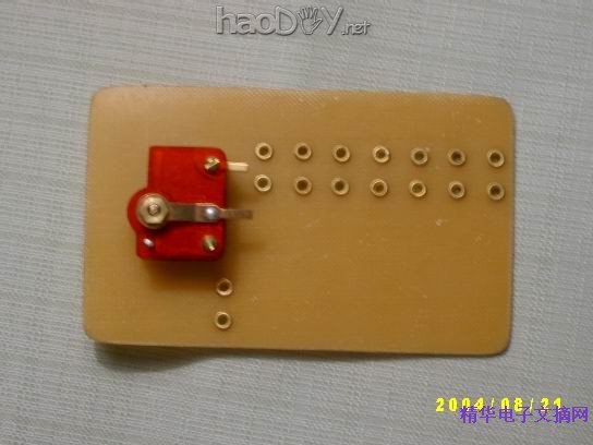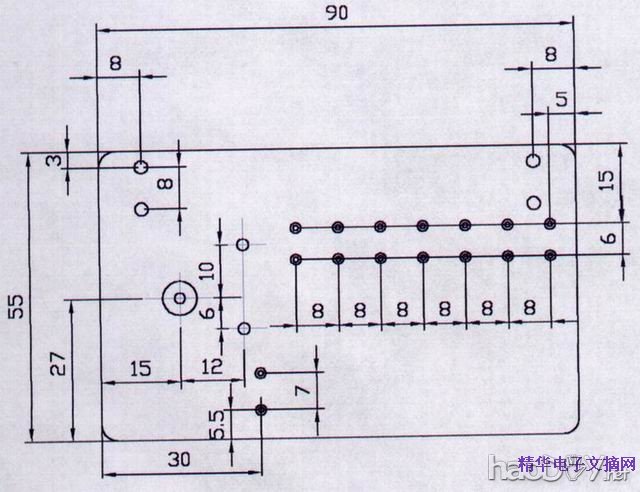 底板 用一块1-1.5mm的环氧板剪成90×55mm,用这个图在纸上按1:1画好贴在环氧板按图打孔,大孔8mm,小孔2mm,