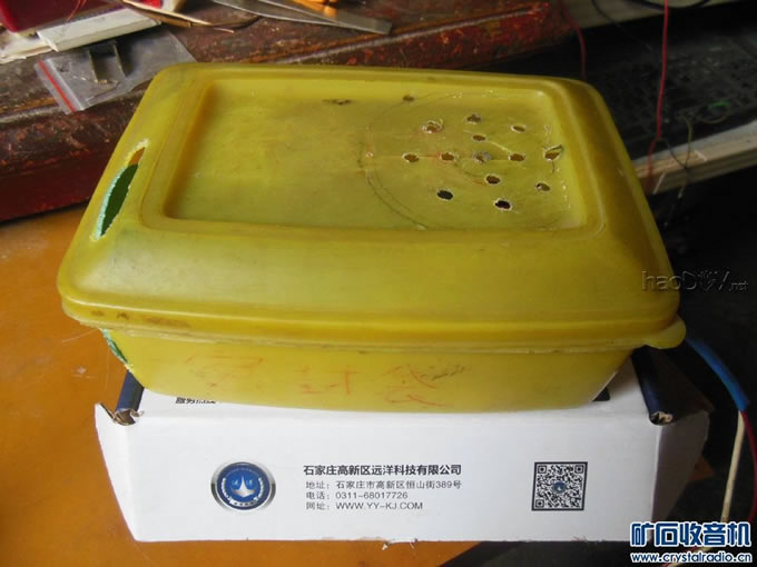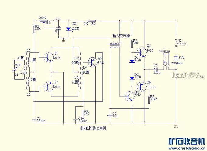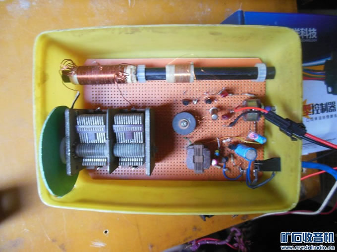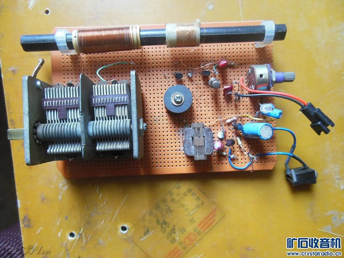 偶尔见过一个电子管推挽高放电路,我想,电子管可以,晶体管也应该可以 ,那么来复呢?在网上搜索,没有找到相应资料。推挽功放是为了节省电流,推 挽高放有什么意义呢?不管结果如何,只管试试吧。想了两天,得到一个推挽来 复晶体管收音机的方案,下面详细介绍: (一)电路: ![]() 天线线圈次级把高频信号分别送到两个晶体管的基极,推挽放大后的信号由集 电极送人高频变压器初级两端,检波三极管把次级送来的高频信号检波,由发射 极重新送回推挽管进行低频放大,由高频变压器初级中点输出到功放电路。 (二)元件选择与制作: 1)若配用360P可变电容器,较长的磁棒调谐线圈可绕55-60圈,次级线圈 双线并绕10圈,首尾相接作中点。 2)来复晶体管可用任何NPN小功率管,如3DG6、9014、9018等等,挑选性 能一致的,直接用对管更好。 3)高频变压器可用闭合磁路的高频磁介质,E型环形罐型均可。三线并绕 80-100圈,电感量2毫亨左右,两组首尾相接作初级,另一组作次级。 4)捡波管用PNP高频锗管,如3AG、3AK等。 5)音频输入变压器初级直流电阻不要超过200欧姆,否则当来复级电流调 大时压降过大,导致来复级工作电压过小。 6)功放是简单的OTL电路,输出两管要配对。 7)推挽电路偏流电位器W兼做音量及灵敏度调节,阻值100K。 (三)实体图: ![]() ![]() ![]() 本机全部电路装在一个孔孔板上,没有找到单联可变,不得不用手头上有 的双联。右上方是推挽电路,下方是功放电路,装好后放在一个塑料饭盒里,喇 叭通过插座接在外边(本想安装在饭盒盖上,但离电路太近,有反馈叫声)。电 源我用的是可充锂电池,用插针座接入,这样便于拔下充电。 (四)调试: 调整R7使功放输出管的中点电压为电源电压的一半。若输出级电流过大 ,可在串联二极管上并上一个适当的电阻使输出级电流达10至20毫安,并重新调 整中点电压。 (五)特点及收听效果: 我感觉本机最大的特点是稳定,不像一般直放机那样动不动就啸叫,大 概是因为推挽中和了两管的正反馈,当正常收听时,断开一个推挽管的基极立即 啸叫,印证了以上的推断。稳定意味着可以放大更多的正能量。当推挽级电流调 到5毫安以上时强信号失真或啸叫,这时声音已经很洪亮了。收弱信号时还可以 把电流调大一些。本机用偏流电位器作音量控制,优点就是接收小信号时可以把 电流调大以增加灵敏度,当然音量也随之增大。 本机收听70公里处的位于郑州的河南两个电台声音洪亮,调大推挽级电 流白天还可以收到中国之声(大概在北京),声音较小。到了晚上把磁棒位于东 西方向,使郑州两个强信号影响最小,调大推挽电流,可收到好几个音量很小的 远地电台,已听到台标的有武汉、济南、江西、中央等,有时在一个位置上两三 个台同时表现,你隐我现,热闹非凡。 如同大多直放收音机一样,本机选择性不太理想,强信号覆盖了弱信号。 (责任编辑:admin) |