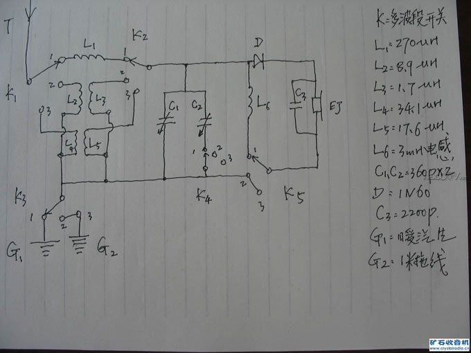 重新贴了个脸,增加了一组短波线圈, 也来参与一下。 线路见图 。天线是6楼顶高出楼顶约1.5米、30米长单股4平方铜线;地线有两根,中波是接暖汽片,短1、短2是约1米长拖线;线圈估计是旧电子管收音机上拆机件,(红色骨架的是备用的 没有接入线路); 可变是360P*2空气连;二极管是接在两个接线柱上的,便于更换,本机用的是1N60;波段开关是从坛上购得的;耳机是“808”的。