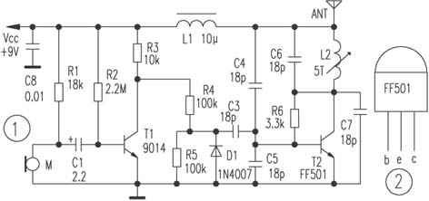 由于使用了专用的发射管,调制度深,不产生幅度调制,失真小,发送距离远,工作稳定。电路简单易制,只要焊接无误即可工作,电路原理见图1所示。 图1电路中,由专用发射管T2和其外围件组成一频率在88~108MHz范围内的高频振荡器,驻极体话筒拾取的音频信号先经T1进行放大,放大后的低频信号再对高频载波进行调制。如断开驻极话筒M,在输入端接放音机输出就能很好地传送音乐信号。 需要说明的是射频发射专用管T2,其型号是FF501,采用标准的T0-92封装(像9000系列三极管一样),外形及引脚排列如图2所示,其ICM为45mA,fT大于1.3GHz,VCEO为13V。专用管的优点就是一致性好,射频输出功率较大,电路容易调整,FF501完全可工作在更高的频段,读者可尝试将发射管用于其它电路的高频发射实验。电路中的L2用∮1.0mm的漆包线在∮5.1mm的钻头上绕5匝脱胎拉长至0.8cm,C3~C8可用高频瓷介电容,天线最好用1.2米的拉杆,并垂直放立。天线一定要架好后再上电。电路的工作电流约25±5mA。如发射频率不在88~108MHz范围内,可适当调整谐振线圈L2的长度。 电路装调好后,用FM段调频收音机作接收,有效传送半径可达500m。 (责任编辑:admin) |