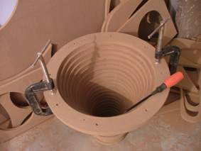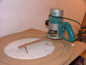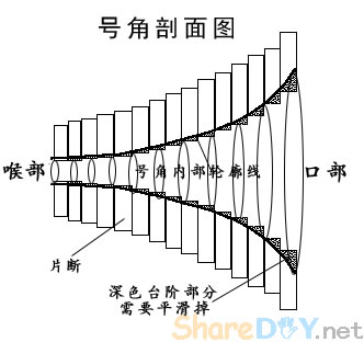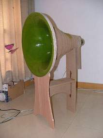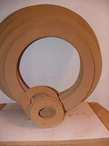 前一段时间我翻译了一篇号角文章,原文共三个部分:前两个部分是号角的历史、号角的物理学原理和号角的设计程序,第三部分是两款号角扬声器的设计制作实例。我只翻出了前两部分,计划将自己制作的一款号角作为文章的续貂,与感兴趣号角的朋友共同研究。原来设想等坛子上的音频测试套件出来以后,附上测试曲线,以避免耳朵试听的主观性,也算是一篇完整的制作报告。无奈套件至今没有到手,参赛截止日期临近,现在先把制作部分写出来,测试曲线日后再补。 从文章中可以看出,最理想的号角轮廓应该是:直线中轴、圆截面、指数形。矩形或正方形横截面、折叠都对声波的传输产生失真,这种失真是与生俱来的。但是,由于形体的限制,数米长的低音号角制作不易,即使做出来,也难有那么大的地方摆放。因此直线号角多数用作中高音传输,而另外做一个折叠低音号角与之组合,成为一个号角系统。由于指数号角的复杂的轮廓曲线、材料及工具的限制,业余条件下,即使制作一款形体较小的中高音直线圆截面号角也实非易事。那么利用简单的工具和市场上可以买到的廉价材料,能不能制作一款直线圆截面号角,让普通发烧友领略号角的美妙呢?答案是肯定的。经过我的苦思冥想,终于找到了一个解决方案。下面就介绍这种设计和制作方法。 由于号角采用指数轮廓曲线,加工这种轮廓通常采用车床等复杂设备,如果你把车床搬到家里,老婆会亲切地在你脸上咬一口,而不是亲一口。使用简单的工具,如何得到连续平滑的指数曲线轮廓呢?我设计了一种简单有效的方法,即将整个号角横着切成多个片断,分段制作,然后组合,最后用手工的方法将不连续的部分平滑掉,最后得到和车床加工一样效果的平滑的指数轮廓。整个号角其实就是由多个面积按指数增长的环形薄片叠加在一起,然后将凸出部分修整后的结果(如图1。) 一、 制作工具及材料: 制作工具主要是木工雕刻机,这是一种兼具切、铣、刨等多种功能的最实用的电动工具,可以完成切割下料、开槽、挖喇叭孔等所有与音箱制作有关的工作,是音箱DIY的利器。建议将它作为闯荡音箱DIY论坛的必备工具。(目前坛上许多朋友为挖喇叭孔犯愁,有了它一切都迎刃而解,包括很让人烦恼的喇叭孔下的那个“台”)除此之外,还有手电钻、木锉刀、游标卡尺、直尺、螺丝刀、夹具等。由于本制作主要是分步加工一定内径和外径的圆环,内径的精度要求较高,自己制作一个雕刻机挖圆的附件是必不可少的。 附件如图2。附件由两部分组成。A部分:找一块1mm厚的铁皮取合适大小,折成U形,折取高度大约8mm,也可找一段U形铝合金型材代替。底部钻Φ3小孔,侧边对应位置开两个6mm宽的豁口。B部分:取一块边长15cm的方形木板,厚度以8mm为宜,在中间开一个Φ16的圆孔,在一边用Φ6的刀头开一个长5mm的槽。准备一个长30-40cm Φ6的螺丝,一端用哥俩好胶粘在小块的槽中。螺冒上到螺丝上,螺丝放进A部分的豁口中,一个挖圆附件就大功告成了。使用时,B上Φ16的大洞是座雕刻机的位置,即所加工工件的圆周处;A上的Φ3小孔是固定在板材上,相当于圆心的位置。雕刻机绕圆心行走一周,一个圆孔就挖成了。可通过调节螺冒得到精确的半径。有兴趣的朋友还可以自己设计更方便、精确的附件。 制作材料为廉价易得的:高密度板、白乳胶、木螺钉、腻子、油漆。高密度板厚度均匀,一般实际厚度和实际厚度不符,要用卡尺量一下,作为设计制作的参考数据。 二、 设计 1、 确定截止频率。 低频的截止点决定了号角口部的尺寸,截止频率越低,口部的尺寸越大。追求较低的截止频率要付出很大的代价:巨大的形体、过多的材料消耗。理智的选择截止频率是十分必要的。本制作选用前一段时间在网上被炒得火热的“毒喇叭”。一是觉得它中高频不错,二是手头有现成的单元,不必再寻找其他单元。还有,根据资料介绍,作为号角驱动单元,谐振频率Fs与Qts的比值要达到120以上,该单元符合这一条件。该单元的截止频率为120Hz左右,于是将120Hz作为号角的截止频率。 2、 喉部尺寸的确定。 喉部尺寸一般与单元的尺寸相配。“毒喇叭”的半径为36mm,于是号角的喉部设计为36mm。但在制作时,将号角喉部的头几个片断做成可拆卸型,以便将来可以对比不同喉部尺寸与单元的匹配效果。 3、 口部尺寸的确定。 口部尺寸由截止频率决定,其计算公式为:r=c/(2π*f*SF1/2),式中r=半径;c=声速;f=截止频率;SF=位置常数,背靠墙为4,墙角为8。为了达到在截止频率附近平直的频率响应,口部周长要在计算结果的基础上乘以1.5的系数,即截止频率要达到80Hz。但是80Hz对应的口部直径过大,为338.4mm,按照选用的高密度板的尺寸不便于下料。人们常说,DIY就是理想与现实之间的妥协,所谓的“不妥协”是不存在的。本设计的口部尺寸妥协后按90Hz处理,半径为300.8mm。号角轮廓曲线经常采用的有纯指数型和曳物线型(tractrix)等。其中曳物线型号角比纯指数型在后半段张开快,因而相同口部面积的号角,曳物线型的总长度较短,本设计采用曳物线型。 4、 号角长度 号角喉部和口部确定以后,长度也就确定下来。号角长度为546.9mm。 5、 分段 这次选用的高密度板标称18mm,实际只有17mm。整个号角按照高密度板的厚度每17mm作为一个片断,每个片断的半径(直径)按照号角的计算公式,由该片断与号角喉部(或口部)的距