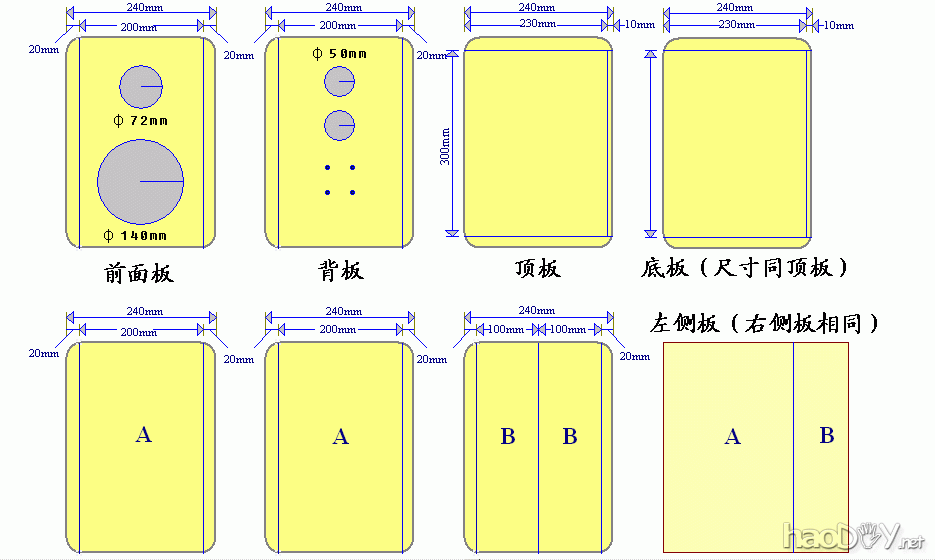 发个竹菜板的切割图。这种竹菜板的尺寸为240mm X 340mm,板厚15mm。一个箱体需要七块板。下面的图纸是一个箱体的。其中侧板是用两块板拼起来的,即图纸标识的A和B两块板拼在一起,侧板反面用边角料做加强筋。