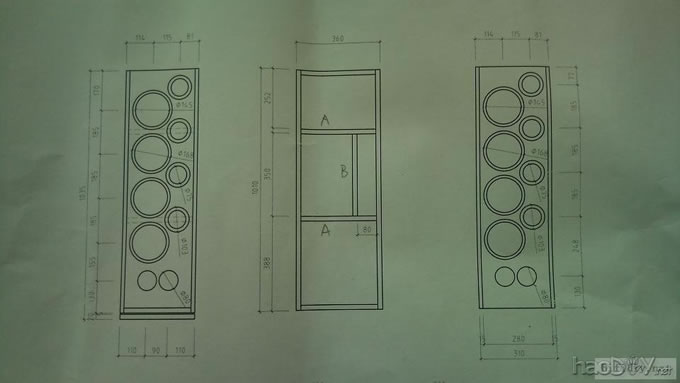 幸福大佬做了一对8单元的落地箱,听说效果不错,多单元的落地箱我一直都想做,但是一直都找不到图纸。现在可好了,幸福大佬这里有图纸,加上已经做出来了,这加强了我做这对箱的信心,但我把图纸改了,改成侧板做面板,内部的隔板换了位置,高音的位置作了调整,容积不变。在这里多谢谢幸福大佬给我的宝贵意见。本来是想自己做的,但由于工作时间的关系我找了木工代劳,现在在正施工中,也拍了不少相片,但今晚我要装JC-2前级,所以没有时间上传,改天有时间就上图,现在先上设计图纸吧!!