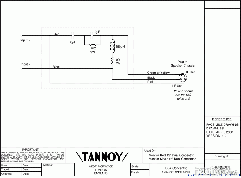 这对箱表现相当全面。它的解析力力奇高,瞬态很好。高音是相当的细腻,细节丰富,小提琴高音部明显能听出相当分明的层次感,弹拨乐器颗粒感强;中频不像TANNOY的家用箱那样过于肥厚,但也是非常的温暖,密度感很强。低音量感足,但是不会显得过重和过冲,而是非常宽松厚实,弹性十足。总体试听三段非常平衡。更难得的是声场相当宏大,定位感很强。乐器的位置和高度相当准确,听人声能让人忽略音箱的存在。 总的一句话:相当成功!而且是一次成功!在试听过程中也曾接TANNOY607,感觉是不忍卒听了。。。差距太大(当然,这种比较很残酷,毕竟它们是相差N个档次的东西) 体会:业余D箱,在使用名厂单元时,如果能找到原厂的参数,最好不要随意改变。严格按照原厂箱数据来制作(包括所用板材、工艺,甚至吸音棉的多少等等)可以保证少走弯路,而且能达到最好的效果 箱子完成快一年了,听得久了,毛病也就出来了。总的一个字:干!来家里听过的烧友也不少,都有同样的感觉:每个人都对它低频的弹跳力饱满度,中频的细致度,高频的分析力印象深刻,但久听之下,便感觉声音硬,大音量下高频压耳朵,乐器比例不对。一句话:惊艳,但不耐听。 于是耐下性子找原因,先怀疑是线材问题,换了几套,依旧!再怀疑功放不对脾胃,换了几台,依旧!最后只能归结到听音环境了。。。无奈!房价这么高,难道要我换房? 还是不甘心,于是边听边分析,会不会是分频器有问题?不至于啊,复刻的原箱分频器。。。。。。思来想去,最后恍然大悟:SL45是录音室监听箱,第一,使用环境不同:录音室是封闭的小空间,近距离听音,换成大空间远距离听音当然会出问题;第二,声音取向不同:监听箱要求忠实再现,重点考虑的不是好不好听,干是它的特色。。。 原因找到了,解决的办法是:换分频,换成TANNOY12寸家用同轴箱的分频! 根据喇叭特性,最终选择了TANNOY红12的分频电路: