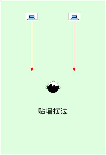 摆法:这是最古老的摆法。将音箱贴近后墙摆,不论是距离后墙50公分或30公分、20公分都没关系,自己去调配即可。通常音箱不需要向内投射角度。