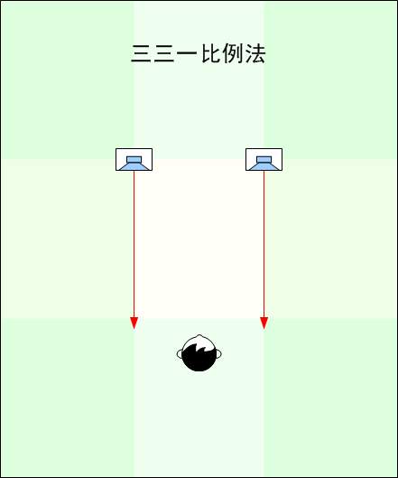 效果:此法亦用于尺寸较大、比例均匀的空间。它与「三一七比例法」的精神是一致的,唯一与「三一七比例法」不同的是二音箱之间的间隔较窄。此法亦可得到平衡的声音与宽深的音场。