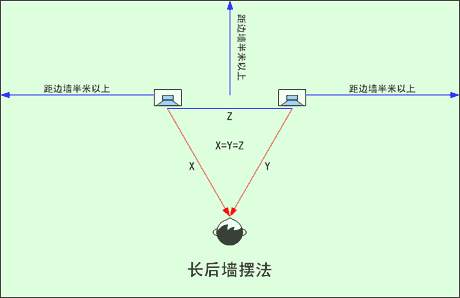 摆法:在一个长方形的房间里,一般玩音响的经验,都会以短边为音箱的后墙。但这个“长后墙摆法”却反其道而行,把长边为音箱后墙。音箱要离开後墙起码要1米以上,而音箱与侧墙的距离起码要半米以上。两个音箱之间的距离与聆听者的位置画等成一个正三角形,两个音箱的向内拗投射角度也要起码45度以上。聆听位置不可贴墙,至少要留一米的距离。