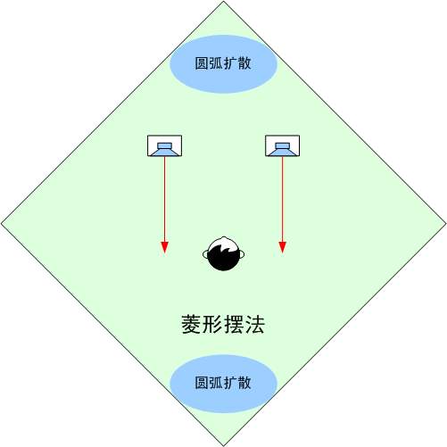 摆法:此法只限正方形空间使用。将正方形空间视为菱形,音箱摆在菱形二边靠墙处。音箱后面的菱形尖角与聆听位置后面的菱形尖角要做圆弧或圆柱声波扩散处理,二音箱不宜靠侧墙太近。