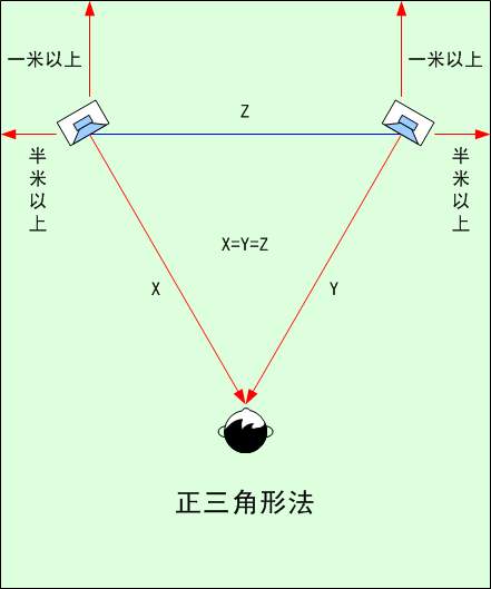 摆法:第一个条件是音箱要离开后墙(至少要有1公尺以上)与侧墙(至少要有0.5公尺以上)。第二个条件是将二个音箱与聆听位置画成一个正三角形。第三个条件是二音箱的向内投射角度也要45度或更多。第四个条件是这个正三角形可大可小。房间小、后级功率不大时正方形小些;房间大、后级功率大时正三角形就可扩大些。