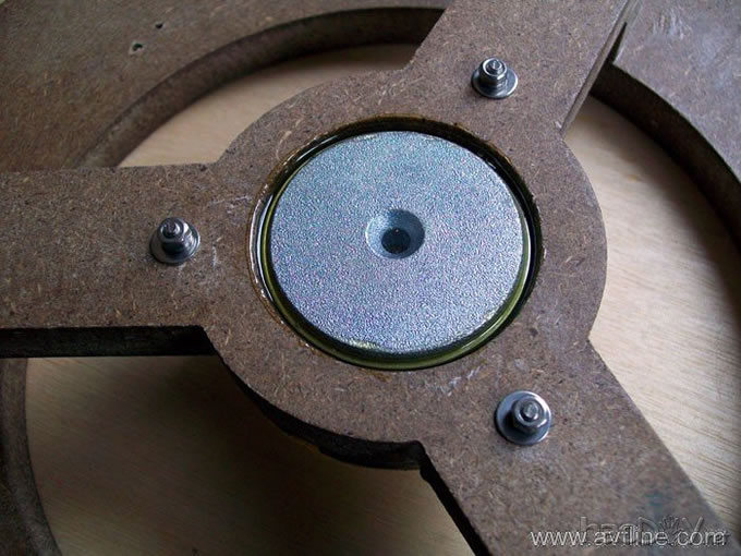 切割了一个小治具套住音规来定位上板和磁路,确保上板的圆心是在中心T铁的正中心。