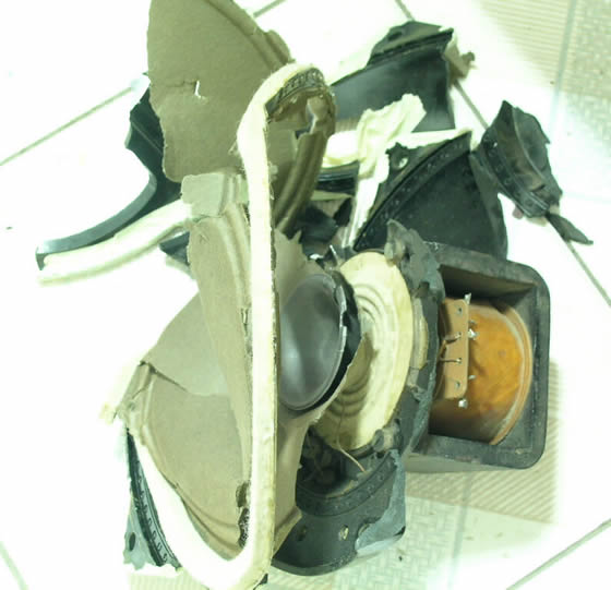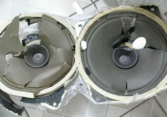 应该不是有意为之,卖家用了一个很大的纸箱,里面都是苞米花一样的减震材料,包裹先是被错误寄到了香港,然后又寄到国内,多次装卸也是损坏原因之一,但最致命的是除了爆米花之外,这对喇叭本身的保护只是一层气泡薄膜,在运输过程中,喇叭由于颠簸沉到包裹底部,这样喇叭就是间隔一层旗袍薄膜和一层纸箱,直接与坚硬的水泥地面或其他硬地面接触了,再加上过呢哦的野蛮装卸,这种结果就出现了