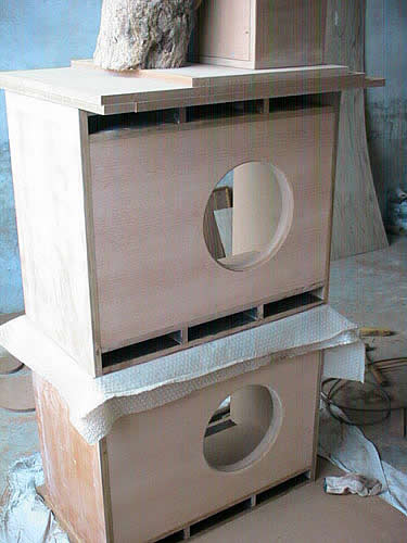 一切准备就绪,可以油漆了,后背板跟箱体是分开油的,刚开始就直接在四楼木工工作室里刷后背板,可没想到油漆味一直窜到了三楼客厅和卧室,LP肚子里的小宝宝可不乐意了,胎动得非常厉害,赶紧停下手里的活送LP上医院,医生让赶紧住院保胎,足足在医院待了一个星期才出院,还好小宝宝最终没什么意外。。要是真为此出点什么事儿的话LP大人父母大人岳丈岳母大人决饶不了我。。谨此小弟奉劝各位想动手DIY一把而家里又碰巧有大肚婆的同学,千万千万千万不可在家里刷油漆!!!!!!!!!!!!!!!!哪怕是所谓的什么狗屁环保漆。。。。现在想起来还后怕。。。。。。最终还是找来邻居帮忙把箱体扛到楼顶封严窗子门口才开始刷油漆(NND,谁叫这箱子又大又重,一个人想扛走它可不轻松),做箱工程总算告一段落了。。。。垫箱底的那个箱就是用余料做的一个中置,所用的单元就是团购坛里E版的飞乐6.5寸,效果还不错