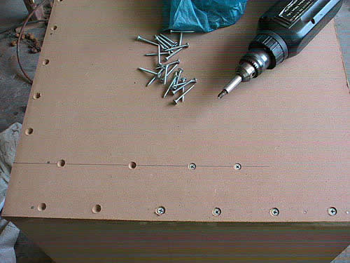开始组装,接合处用白乳胶+自攻钉,上钉之前先用手电钻钻孔再用修边机上V形刀开沉孔