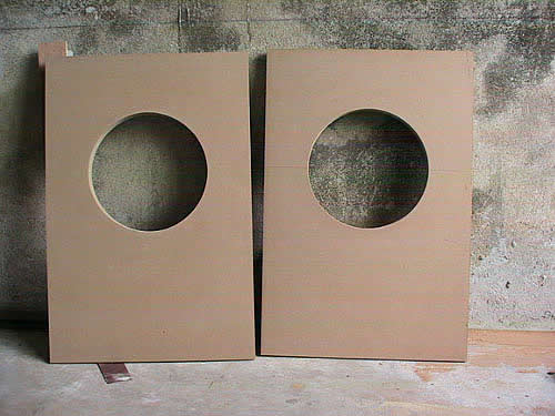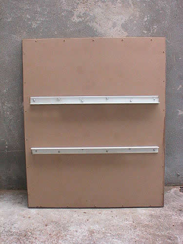 这块是后背板,本来这款箱图纸上是前开式面板的,但小弟还是觉得采用后开式内装单元比较养眼,这样前面板就不会四周一圈钉眼影响市容了。但采用后开式的话后背板又会跨度增大而造成谐振增强,为此就要上加强筋了,但跨度比一般的箱体要大得多,用过小的方木的话起不到多少效果,太大的方木或木板的话又会占去一定的箱体容积,正为此苦恼时看见墙脚有几根装空调剩下的角铁,心想角铁刚性比木头要好得多而且又不会占去多少箱体的容积,遂每块背板都用自攻钉上了两根角铁。。