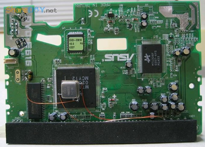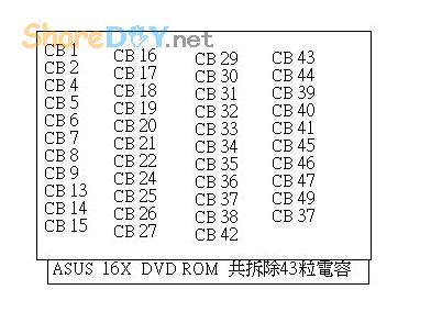 再一提,這件電路板是雙面的,(即底和面都有靈件),必須細心認定電容的編號才動手,因為拆錯了是不易裝回原位的。若成功拆去所有43粒電容,可將線路板裝回DVD ROM再接上電源,記住每次改料要拔除電源(電腦白色的四腳插)之前必須將總電源關掉,等穩壓器儲的電慢慢放後才拔插或插上電源插,否則很有可能燒毀電路板。