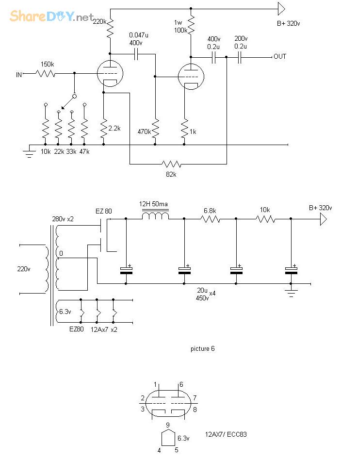 若閣下有玩黑膠碟的經驗就知道,未開聲之前,第(一)要拆去唱盤面透明遮塵的膠蓋,第(二)拆去唱盤底的保護底,第(三)唱頭也要拆殼,(要找專業師傅才行)。做足這三部功夫玩黑膠碟有幾大幫,玩TOP Loading CD一樣有異曲同工的收效,高中音通透開揚而增強層次及空氣感是兩者共有的,但有一點不同之處是TOP Loading CD 改善低音的幅度很大,這收獲似乎不單是玩諧振問題,而是能改善機箱可減少雷射光的多次折射而減少失真,令聲音更加真實,玩黑膠盤拆殼的經驗收效是預期好,玩TOP Loading CD 的收獲是超出要求的,細膩的高音,更實在活現的人聲,低音豐厚的質感更令我雀躍萬分。但是機殼的處理會是讀者的主要難題,筆者找到一個焗漆的機箱,鐵的厚度約1mm巳足夠,難處是將CD轉盤放上機箱頂,而線路板及穩壓部份裝在機箱裹,計算位置開孔要準確,螺絲位、雷射頭引線,馬達連接線等,要細心準確,尤其是雷射頭的扁帶形引線是活動的,要留意計算它的活動範圍,量度位置要準,金工手藝要精,確是大工程,但當完成後的喜悅與那繁複的工序比巳是微不足道了。接下來就是介紹CD放大的製作,請看線路圖(六),是簡潔而易於製作,放大部份用兩隻12AX7分兩級放大,第一級是主要增益,第二級是緩衝放大,有些製作者喜歡一支膽全供應一聲道,即另外一支供另一聲道;但筆者卻推薦每支膽分左右而作兩級放大,即第一支作左右聲道的增益放大,而第二支膽則作左右的緩衝放大,因此可避免配對膽的煩惱,而甚至可以兩支12AX7不同牌子或不同年期,更增添玩膽的樂趣。輸入方面筆者慣用兩刀六選擇制作輸入靈敏度調校,亦即等效於分流電阻volume,因採用的是選擇制,故此最好在靜止無音樂時調校,否則在格與格之間會有 “啪” 聲,電源部份用一支EZ80整流,簡單的一級CHOKEπ型濾波巳足夠,總結而論這CD放大是簡易又價簾的製作,只要用料上乘加上高質素膽就容易好聲。