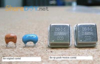 跟著就是放Crystal 石英晶體,請看圖(四)細細粒的DVD ROM原裝晶體,頻率是33.86 MHZ ,現在要出補品了,正是圖上較大粒方形金屬外殼的那粒,頻率是33.8688 MHZ,準確度高多兩個位數字,而還要獨立提供5V的電源,高班的零件當然是不簡單,收效亦是不簡單的,這晶體的準確度是對聲音有很直接的影響。當石英晶體接在合適的電路上就會產生固定的振盪頻率,這頻率用在CD或DVD ROM是提供固定的參考頻率取樣作數碼的參考穩定,因此數碼頻率愈穩定,聲音質素就愈高和愈低失真,更接近LP的ANALOG味。若果讀者對於這DVD ROM有更一步的興趣,再玩盡多一步的話,可將這ROM改做Top Loading型式,即是在頂放CD碟,將轉盤(包括雷射頭,馬達等機部份拆下)放在機頂,請看圖(五)這樣做可對聲音大大改良,第(一)減少原有密封式的金屬外殼所產生的聲箱共鳴效應,亦即共鳴聲箱的渲染,第(二)CD碟高速轉動時產生的諧振噪聲可以得繹放。第(三)當雷射頭閱讀CD時是將雷射先射上CD面的數碼刻紋再反射回另一部份接收的雷射頭,而得到的數碼訊號,但這個過程在密封的鐵殼內是涉及很多的不必要折射而產生渲染,對聲音是很大的破壞,這個Top Loading就能解?這三大問題了。