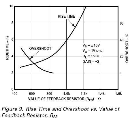 另外有一张图表很重要,它给出了上升时间rise time/过冲overshoot与反馈电阻Rfb大小之间的关系。可以看到,上升时间和过冲是一对矛盾,很难左右逢源。但存在这样一个区间:Rfb=600~800ohm,两者都在让人可以接受的范围内。