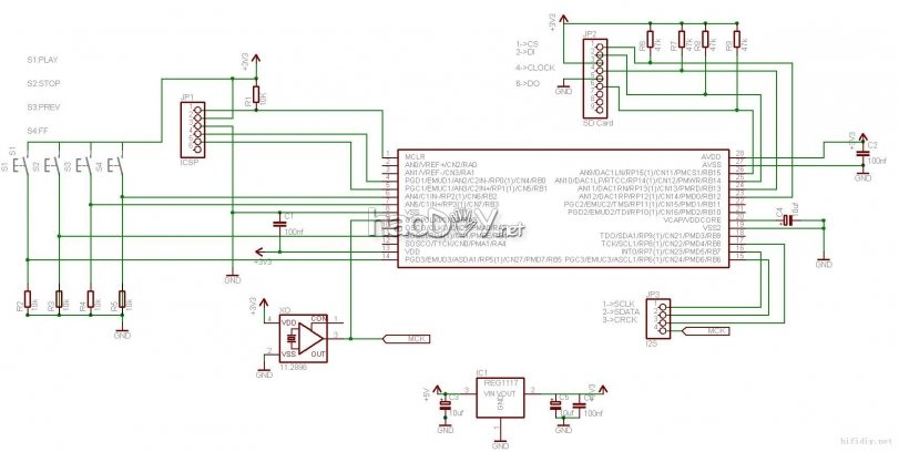 3.sd卡座下面就是dspic33FJ64GP802  算是dspic家属的小弟弟了 可是机能并不弱 8个DMA  4 个缓存可供 I2S 行使, 根基不占用 cpu 播放wav很是抱负