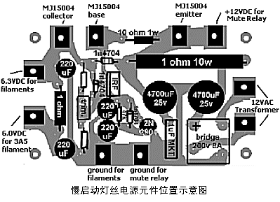本机灯丝不用直流供电时也没有什么噪声。不过,为了使灯丝电压更加稳定,我建议用图7的慢启动电路来代替图4和图5的线路。并且,版本二的3A5要求使用直流灯丝供电,此电路也最为适合。慢启动电源可以延长电子管的寿命!MJ15004需要加装散热器,它的功耗是12W。
