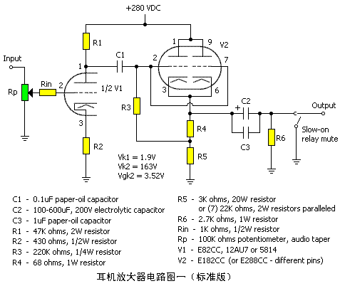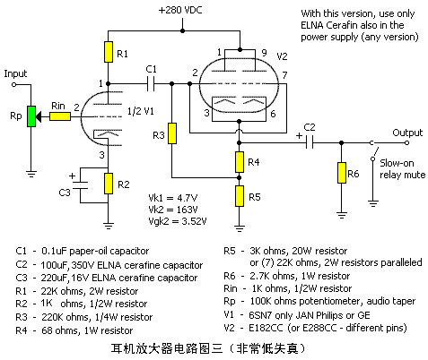在以上三个版本中,输出电子管V2的偏流都是每只26mA(加起来52mA),总功耗6W(2x3W)。仅指使用Mullard或JAN Philips的电子管而言。