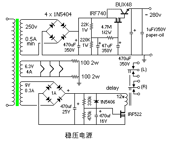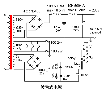 就电源而言,灯丝用交、直流供电均可,但是版本二中的3A5除外,它必须用直流供电。每种电源都带有延时继电器,它在电子管进入稳定工作状态之前使输出静音。我设计了三种电源-稳压电源、被动式电源和廉价被动式电源: